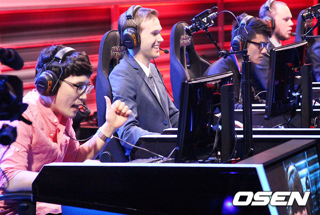 결승전을 앞두고 해설자들과 프로선수들간의 이벤트 경기가 열렸다. 이벤트전에 참가한 온게임넷 '클템' 이현우 해설이 득점을 올리자 엄지손가락을 지켜들고 있다. /scrapper@osen.co.kr