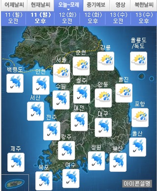11일 기상청에 따르면 오늘 차츰 흐려져 낮에 제주도와 전남 해안 지방을 시작으로 밤에는 전국에서 비가 내리겠다. 이번 비는 남부와 제주도에 집중되겠으며 특히 벼락과 돌풍을 동반하겠고, 시간당 30mm 이상의 강하고 많은 비가 예상되면서 호우 예비 특보도 내려져 있다.