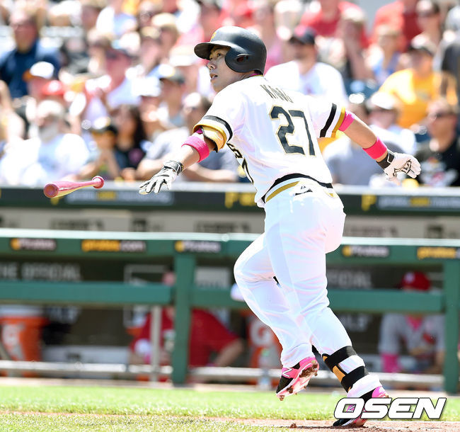하지만 3-3 동점으로 맞선 7회 1사 2루 찬스에서 강정호의 방망이가 다시 한 번 불을 뿜었다. 구원 미치 해리스와 승부에서 초구 스트라이크를 흘려보낸 뒤 2구 몸쪽 높게 들어온 95마일 패스트볼을 받아쳤다. 타구는 좌측에 떨어지는 안타가 돼 2루 주자 스티브 롬바르도치를 홈으로 불러들였다. 이날 경기의 승부를 가른 결승타로 시즌 타점 9점째를 수확했다.