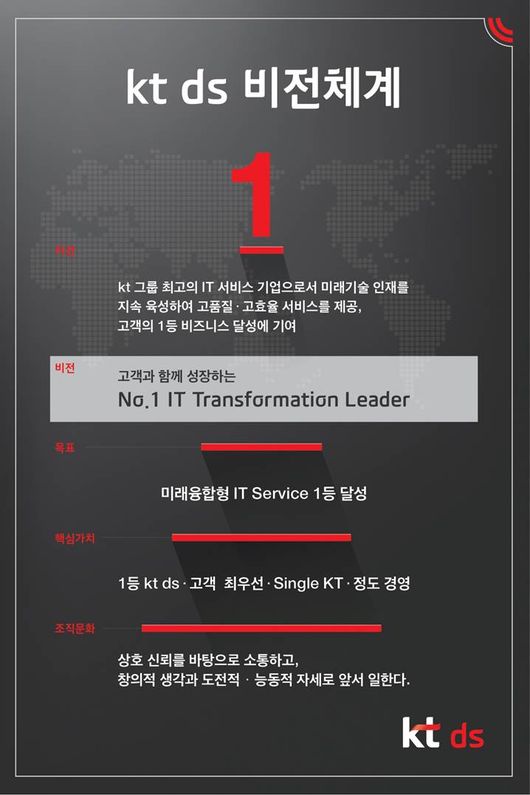 특히 새로운 비전은 임직원의 참여로 완성됐다는 점에서 의미가 크다. 지난 1월 김기철 사장이 취임한 직후 신 비전체계 전담반이 구성됐고, 설문조사와 워크숍 등을 통해 임직원 81%(1067명)의 의견을 직접 청취해 완성됐다. 이와 함께 인재상 수립과 인사제도 개선 등 혁신활동도 본격화했다. kt ds의 강한 혁신 의지는 슬로건 '오늘도 Do Better, 내일은 두 배로'에 담았다.