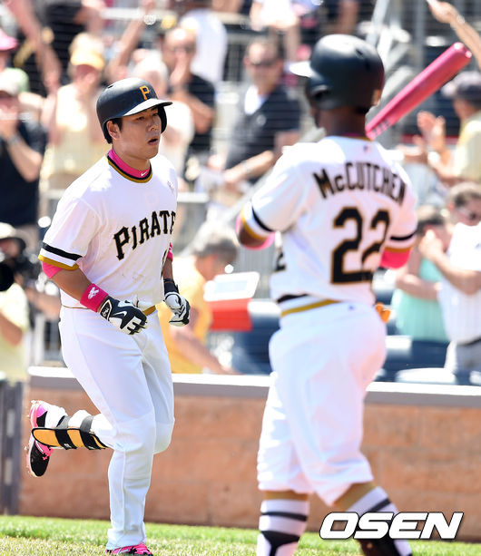 하지만 3-3 동점으로 맞선 7회 1사 2루 찬스에서 강정호의 방망이가 다시 한 번 불을 뿜었다. 구원 미치 해리스와 승부에서 초구 스트라이크를 흘려보낸 뒤 2구 몸쪽 높게 들어온 95마일 패스트볼을 받아쳤다. 타구는 좌측에 떨어지는 안타가 돼 2루 주자 스티브 롬바르도치를 홈으로 불러들였다. 이날 경기의 승부를 가른 결승타로 시즌 타점 9점째를 수확했다.