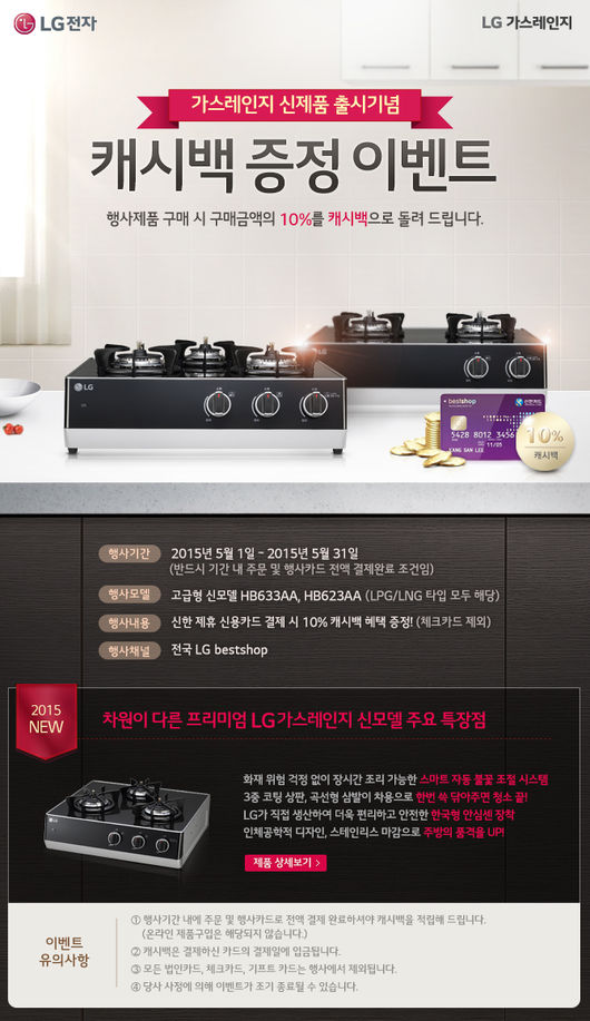 LG전자에 따르면 오는 5월 31일까지 전국 베스트샵에서 진행하는 이번 이벤트는 신한 제휴 신용 카드로 결제하면 구매가격의 10%를 캐시백으로 돌려받을 수 있다. 이벤트 대상모델은 고급형 신모델 HB633AA, HB623AA(LPG/LNG 타입 모두 해당)이다.