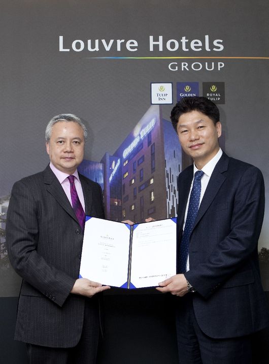 루브르호텔그룹 필리아스 로우 골든튤립 중국지사 수석부회장(왼쪽)과 ㈜트리플인베스트 표종민 대표 / 루브르호텔그룹 제공