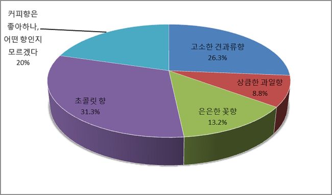 커피비평가협회 관계자는 “초콜릿 향이 나는 커피는 보통 최고급 커피를 의미하며, 커피애호가라면 본능적으로 추구하는 향미이다. 초콜릿 향과 견과류 향을 좋아한다는 응답이 절반을 훌쩍 넘은 것은, 국내 소비자들이 커피에서 단 맛을 추구하고 있음을 보여준다”고 풀이했다.