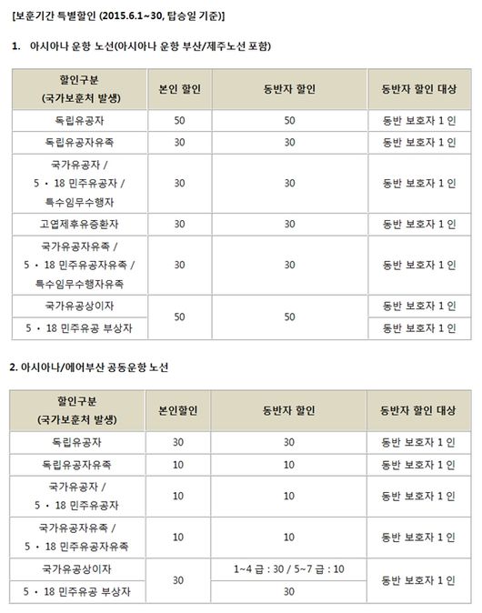 아시아나는 평소 국가를 위해 헌신한 유공자 및 유공자 유족에게 국내선 탑승시 30~50%의 할인혜택을 제공하고 있으며, 금번 보훈기간 동안 그 대상을 확대하여 이들과 동행하는 보호자 1인에게도 동일한 혜택을 제공할 예정이다.