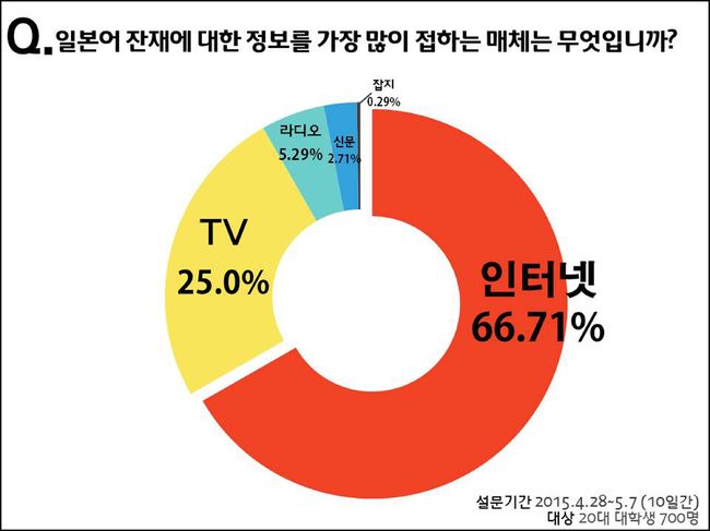 또한 '일본어 잔재에 대한 정보를 가장 많이 접하는 매체는?'이라는 질문에는 인터넷(66.7%), TV(25%), 라디오(5.3%), 신문(2.7%) 순으로 집계 됐다.