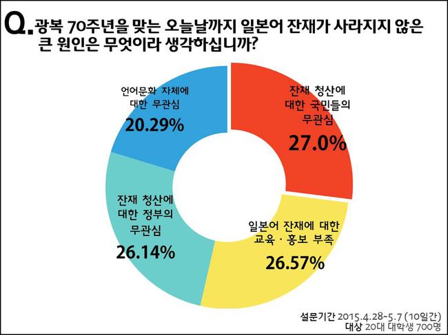 특히 '광복 70주년을 맞는 오늘날까지 일본어 잔재가 사라지지 않는 가장 큰 이유는?'에 대해서는 국민들의 무관심(27%), 일본어 잔재에 대한 교육 및 홍보 부족(26.6%), 정부의 무관심(26.1%)순으로 결과가 나왔다.