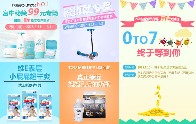 구매 순서에 따라 추첨을 통해 순금을 차등 지급하는 '0to7을 찾아라, 황금을 잡아라'이벤트와 프리미엄 한방 유아 스킨케어 궁중비책 제품을 99위안에 판매하는 '한국 유아 화장품 no.1 궁중비책 99위안의 기회' 이벤트, 응원 댓글을 작성하는 이용자 중 추첨을 통해 제로투세븐에서 국내 독점판매 하고 있는 승용완구 브랜드 Y볼루션의 글라이더를 증정하는 '0to7에게 응원 댓글 쓰고 상품 받자'이벤트 총 세 가지가 진행된다.