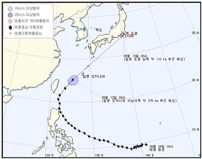 기상청은 6호 태풍 ‘노을’이 12일 새벽 3시 현재 일본 오키나와 서남서쪽 약 270km 부근 해상을 지나고 있다고 밝히고 일본 열도 남쪽을 지나갈 것으로 예상하고 있다.