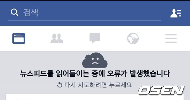 12일 오전 1시간 가량 접속 불량을 일으킨 페이스북 화면 캡처.