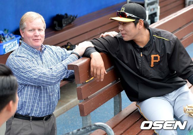 12일(한국시간) 미국 펜실베니아주 필라델피아 시티즌스 뱅크 파크에서 열리는 '2015 메이저리그' 필라델피아 필리스와 피츠버그 파이어리츠의 경기를 앞두고, 피츠버그 닐 헌팅턴 단장과 강정호가 대화를 나누고 있다.