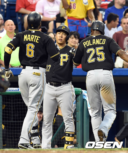 12일(한국시간) 미국 펜실베니아주 필라델피아 시티즌스 뱅크 파크에서 열리는 '2015 메이저리그' 필라델피아 필리스와 피츠버그 파이어리츠의 경기,3회초 2사 1,2루 강정호가 스리런 홈런을 친 마르테를 반갑게 맞이하고 있다.