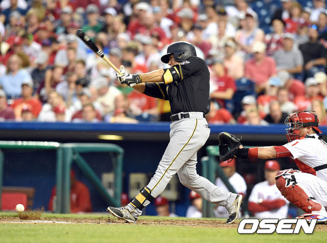 12일(한국시간) 미국 펜실베니아주 필라델피아 시티즌스 뱅크 파크에서 열리는 '2015 메이저리그' 필라델피아 필리스와 피츠버그 파이어리츠의 경기,4회초 무사 선두타자로 나선 강정호가 유리한 볼카운트에서 투수 앞 땅볼을 치고 있다.