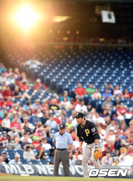 12일(한국시간) 미국 펜실베니아주 필라델피아 시티즌스 뱅크 파크에서 열리는 '2015 메이저리그' 필라델피아 필리스와 피츠버그 파이어리츠의 경기,강정호가 석양 빛을 받으며 3루 수비를 하고 있다.