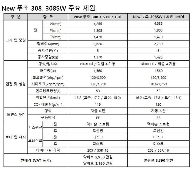 한편, 지난해 6월 출시된 2.0 BlueHDi 모델은 악티브(Active), 알뤼르(Allure), 펠린(Feline) 세 가지 트림으로 구성 돼 있으며, 가격은 각각 3,390 만원, 3,490 만원, 3,740 만원이다(모두 VAT 포함). 푸조 308SW 2.0 BlueHDi 모델도 악티브(Active), 알뤼르(Allure), 펠린(Feline) 3개 트림으로 구성되며, 가격은 각각 3,490만원, 3,690만원, 3,850만원이다.(모두 VAT 포함).