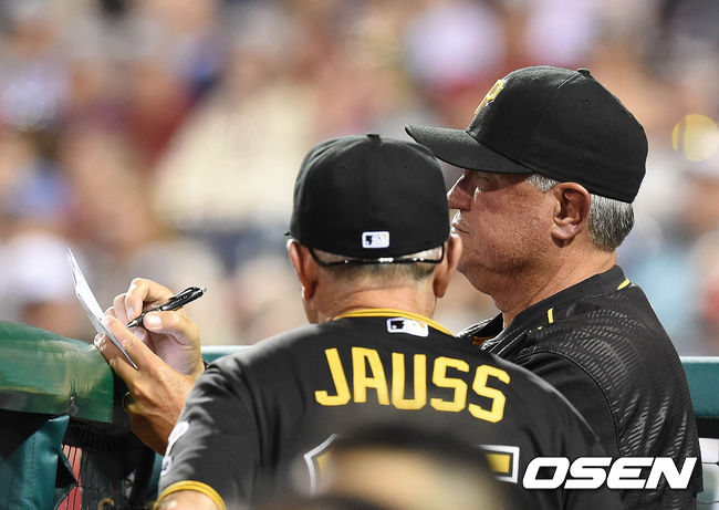 6회초 피츠버그 공격 1사 주자없는 상황 강정호가 필라델피아 투수 저스틴 데 프라투스의 공에 맞고 진루하자 허들 감독이 메모를 하고 있다.