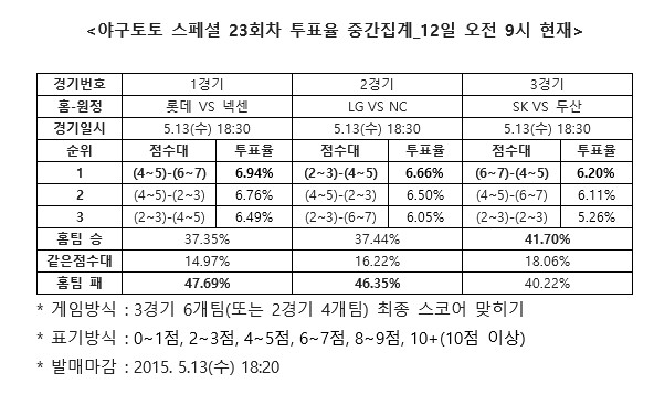 KBO 3경기 대상 야구토토 스페셜 23회차 투표율 중간집계