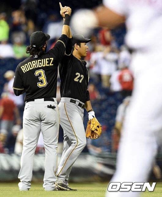 경기 종료 후 피츠버그 강정호와 션 로드리게스가 승리의 인사를 나누고 있다./dreamer@osen.co.kr