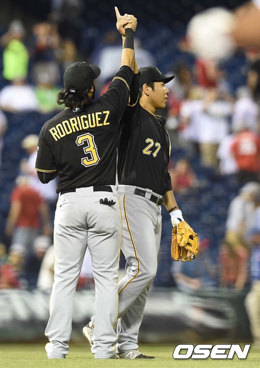 경기 종료 후 피츠버그 션 로드리게스와 강정호가 승리의 인사를 나누고 있다./dreamer@osen.co.kr