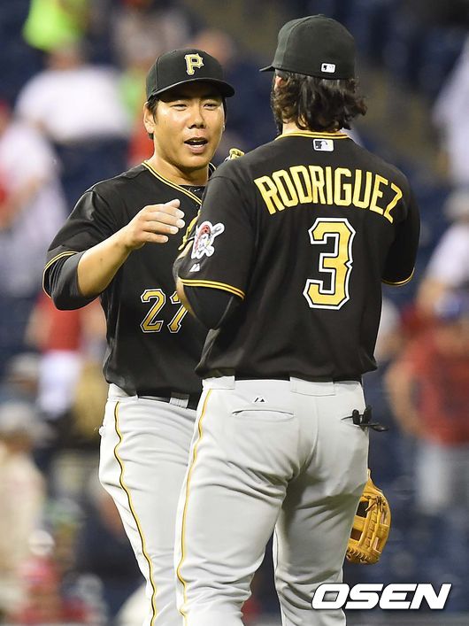 경기 종료 후 피츠버그 강정호와 션 로드리게스가 승리의 인사를 나누고 있다./dreamer@osen.co.kr