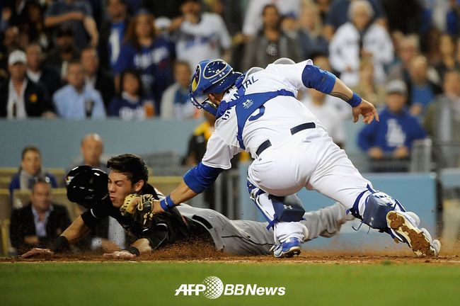 1-1 동점이던 7회 LA 다저스 스캇 밴슬라이크의 송구로 홈에서 아웃되는 마이애미 크리스 옐리치. 우측은 다저스 포수 야스마니 토마스 ⓒAFPBBNews = News1(무단전재 및 재배포 금지)