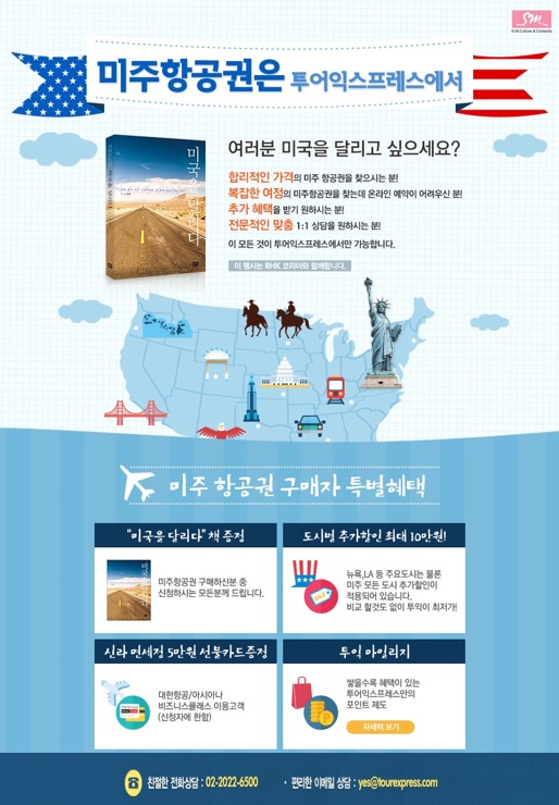일단 모든 구매자들에게 ‘미국을 달리다’ 책을 증정하고 있으며, 뉴욕과 LA 등 주요 도시는 물론이고 미주 모든 도시에 추가 할인 금액을 제공한다. 이런 혜택을 통해 미주 지역 항공 최저가를 보여주겠다는 홍보 문구를 자연스럽게 되새기고 있다.