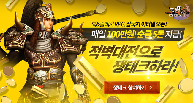 게임 내에서는 14일부터 6월 3일까지 매일 밤 30분씩 펼쳐지는 '적벽대전'을 통해 참여자 전원에게 '아이템 상자'를 증정하고, 참여한 300명의 이용자 중 하루 한 명씩 추첨을 통해 100만원 상당의 혜택을 제공한다.