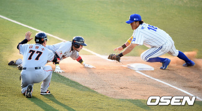 12일 오후 대구야구장에서 열린 '2015 타이어뱅크 KBO 리그' 삼성 라이온즈와 한화 이글스의 경기, 1회초 1사 1루에서 한화 이용규가 김경언의 좌중간 안타에 3루까지 내달렸지만 베이스를 지나치며 삼성 박석민에 태그아웃되고 있다.