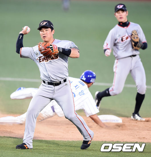 12일 오후 대구야구장에서 열린 '2015 타이어뱅크 KBO 리그' 삼성 라이온즈와 한화 이글스의 경기, 2회말 1사 1루에서 한화 정근우가 삼성 김재현의 2루땅볼 타구에 1루 주자 이지영을 태그아웃시키고 1루로 송구하고 있다.