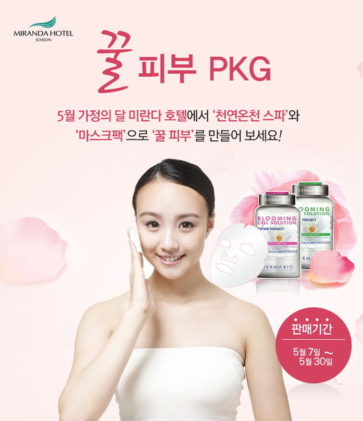 미란다 호텔의 ‘꿀피부 패키지’ 스탠다드 룸 1박과 스파플러스 2인 이용권 그리고 설레임의원(강남피부과)에서 만든 ‘설레임 블루밍 셀 듀얼이펙트 마스크팩’ 1박스(재생/미백 택 1, 1박스당 10매입)를 증정하는 패키지로 주중(일~목)에는 15만 원(부가세 및 봉사료 포함)으로 주말(금, 토)과 공휴일은 18만 원(부가세 및 봉사료 포함)에 이용 가능하다.