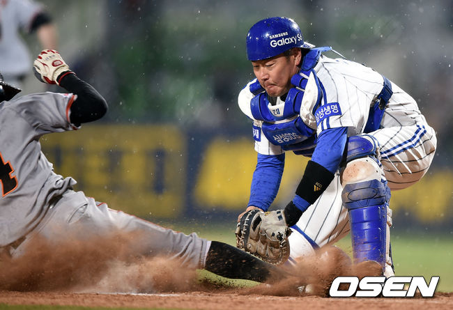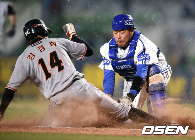 9회초 1사 3루에서 한화 강경학이 김회성의 3루 땅볼에 홈에서 삼성 진갑용에 태그아웃 당하고 있다. 한화는 합의 판정을 요구했지만 결과는 바뀌지 않았다. /jpnews@osen.co.kr
