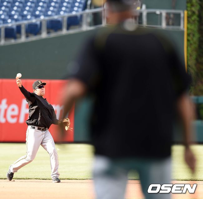 13일(한국시간) 미국 펜실베니아주 필라델피아 시티즌스 뱅크 파크에서 열리는 '2015 메이저리그' 필라델피아 필리스와 피츠버그 파이어리츠의 경기를 앞두고, 피츠버그 강정호가 클린트 허들 감독에게 펑고를 받은 뒤 1루로 송구하고 있다.