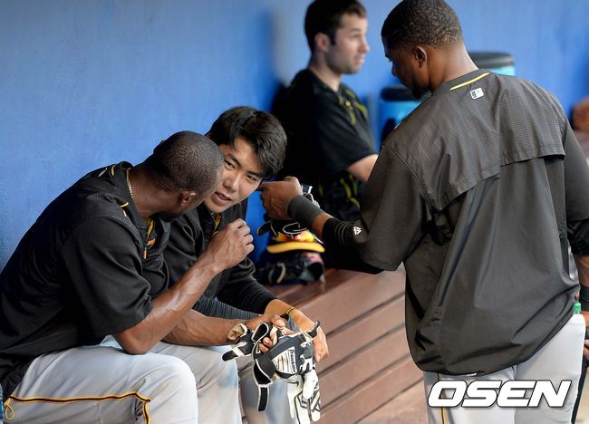 13일(한국시간) 미국 펜실베니아주 필라델피아 시티즌스 뱅크 파크에서 열리는 '2015 메이저리그' 필라델피아 필리스와 피츠버그 파이어리츠의 경기를 앞두고, 피츠버그 강정호가 타격 훈련을 앞두고 스탈링 마르테(왼쪽) 그레고리 폴랑코와 대화를 나누고 있다.