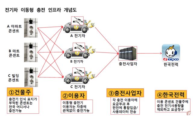전기차 이동형 충전 인프라는 전용 주차장이 있어야만 설치가 가능했던 고정형 충전기와 달리 공동 주차장의 기존 전원 콘센트에 ‘서비스 인식 태그’를 설치한 후, ‘이동형 충전 단말기’을 통해 전기차 충전이 가능하도록 만들어주는 솔루션으로 별도의 충전설비 구축이 필요 없이 간단하게 이용이 가능하다.