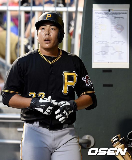 4회초 피츠버그 공격 무사 1, 3루 상황 강정호가 헛스윙 삼진으로 물러난 뒤 더그아웃에서 장갑을 벗고 있다.