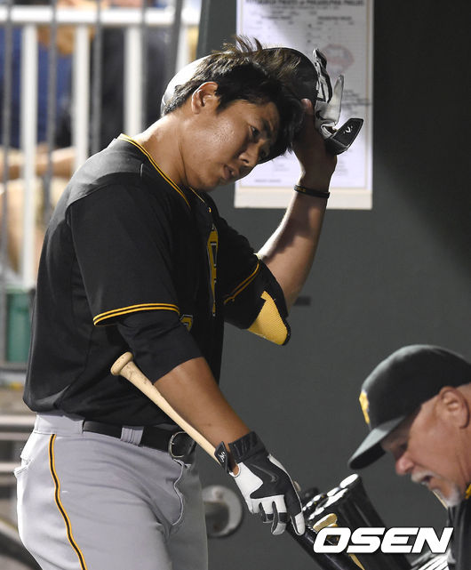 8회초 푸수플라이로 물러난 강정호가 아쉬워하고 있다.