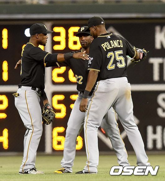 경기 종료 후 피츠버그 스탈링 마르테-앤드류 맥커친-그레고리 폴랑코가 승리의 세리머니를 펼치고 있다./dreamer@osen.co.kr