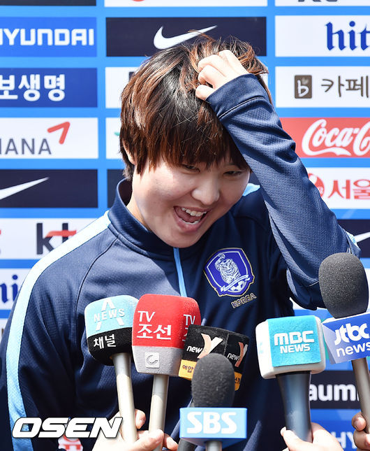 지소연이 훈련을 마친 후 인터뷰를 하며 쑥스러워 하고 있다.