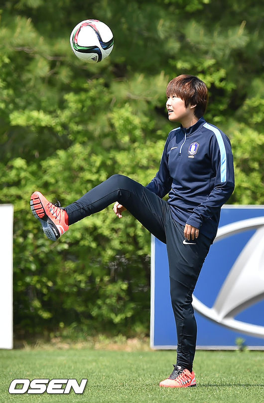 지소연이 훈련때 공으로 몸을 풀고 있다.
