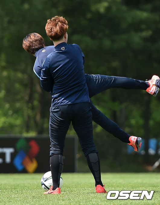 지소연이 훈련때 콘을 정리하던 도중 GK 전민경에게 번쩍 들리고 있다.