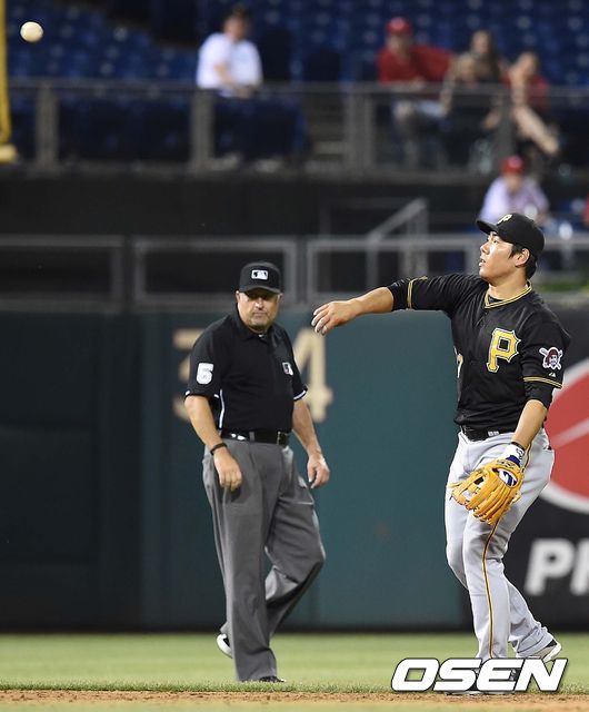 6회말 필라델피아 공격 무사 3루 상황 피츠버그 유격수 강정호가 프레디 갈비스의 타구를 멋지게 점프해 잡아낸 뒤 동료들에게 볼을 건네고 있다./dreamer@osen.co.kr