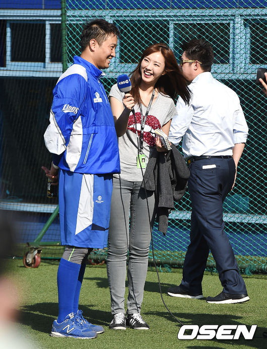13일 오후 대구야구장에서 열린 '2015 타이어뱅크 KBO 리그' 삼성 라이온즈와 한화 이글스의 경기, 경기에 앞서 정인영 아나운서가 삼성 채태인과 인터뷰를 하고 있다.