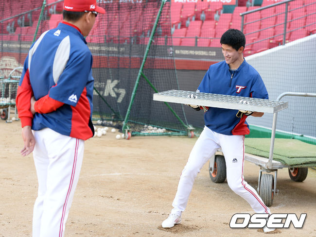 경기전 KIA 강한울이 하체훈련을 위해 무거운 철판을 들고 타격훈련을 하고 있다.