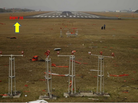 착륙 할 때 활주로 시단으로부터 약 400m 전방 4.0m 높이의 접근등에 최초 부딪친 후 약 70m 지나 약 6.2m 높이의 계기착륙시설(로칼라이져 안테나)에 양쪽 엔진과 랜딩기어가 충돌했다. 계기착륙시설 충격 후 약 180m 지나 동체 뒷부분과 바퀴가 지면에 충격된 흔적이 있는 것으로 조사됐다. 이후 활주로 시단에서 약 1100m 활주 후 반시계 방향으로 180° 돌면서 녹지대에 정지했다.