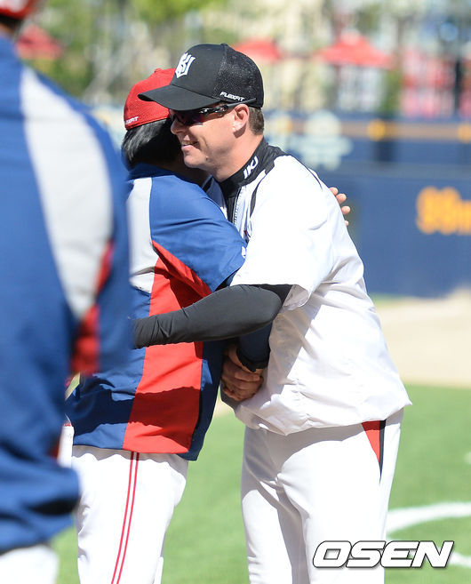 경기전 KIA 박흥식 코치와 kt 옥스프링이 포옹을 하고 있다.
