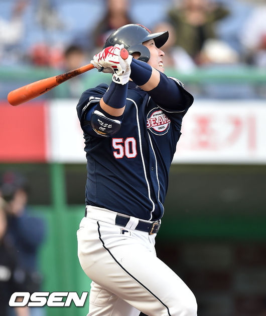 13일 오후 인천 SK행복드림구장에서 열린 '2015 타이어뱅크 KBO 리그' SK 와이번스와 두산 베어스의 경기, 1회초 무사 주자 1,2루 두산 김현수가 좌월 선취 스리런 홈런을 날리고 있다.