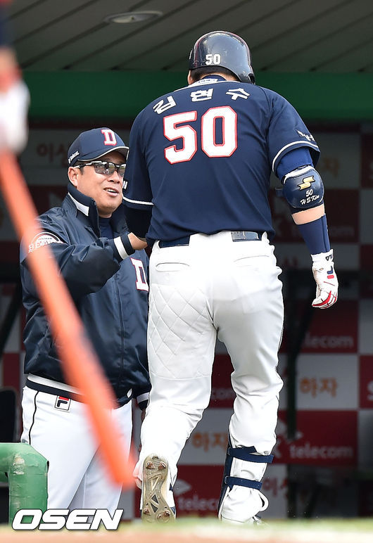 13일 오후 인천 SK행복드림구장에서 열린 '2015 타이어뱅크 KBO 리그' SK 와이번스와 두산 베어스의 경기, 1회초 무사 주자 1,2루 두산 김현수가 좌월 선취 스리런 홈런을 날린 후 덕아웃에서 김태형 감독과 하이파이브를 하고 있다.