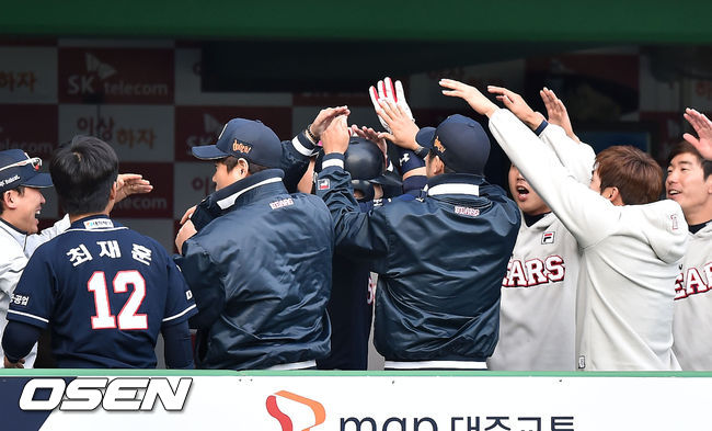 13일 오후 인천 SK행복드림구장에서 열린 '2015 타이어뱅크 KBO 리그' SK 와이번스와 두산 베어스의 경기, 1회초 무사 주자 1,2루 두산 김현수가 좌월 선취 스리런 홈런을 날린 후 덕아웃에서 동료들과 기쁨을 나누고 있다.