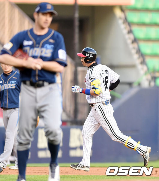 13일 잠실구장에서 열리는 ‘2015 타이어뱅크 KBO리그’ LG 트윈스와 NC 다이노스의 경기, 1회말 LG 선두타자 정성훈이 동점 1점 홈런을 날린뒤 베이스를 돌고 있다.
