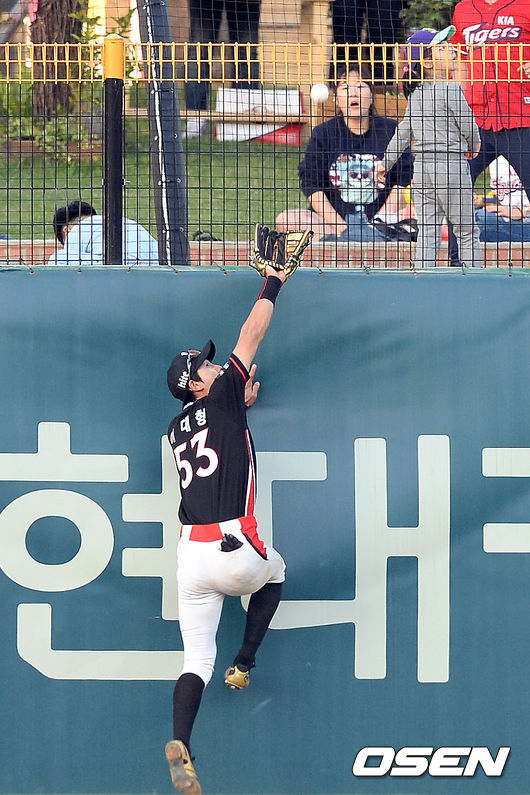 1회말 1사 2루 kt 이대형이 KIA 최희섭의 타구를 잡아내고 있다.